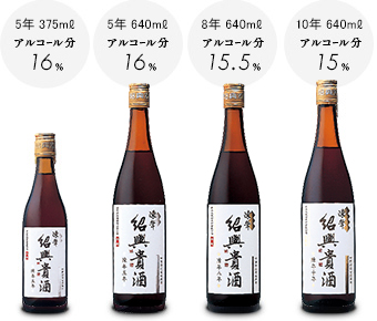 “本格手作りにこだわった逸品”紹興貴酒の“貴”はまさしく作り手の自信を表すものです。希望小売り価格 5年 375mℓ ¥826(税別) 5年 640mℓ ¥1,356(税別) 8年 640mℓ ¥1,648(税別) 10年 640mℓ ¥2,347(税別)
