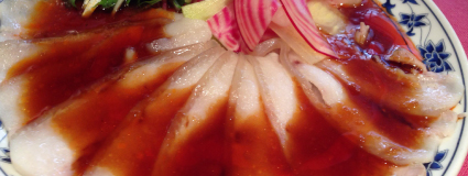 鎌倉の夏野菜を添えた雲白肉「豚肉の薄切りニンニクソース掛け」は絶品。