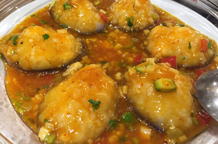 写真は秋茄子の海鮮すり身のせ辛味蒸し。