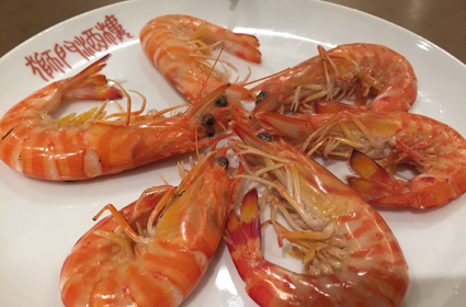 紹興酒で、エビを酔わせ、湯びきにしたお料理です。写真のように鮮やかな色合いに仕上がります。