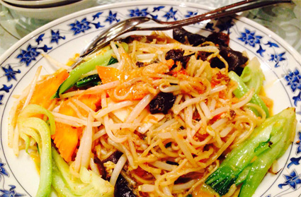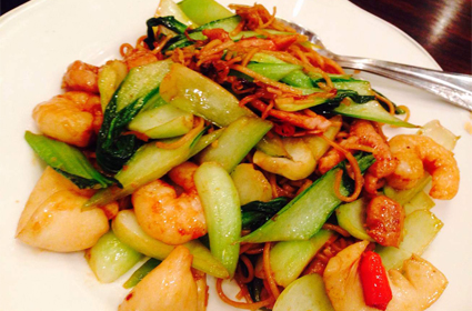 海鮮酔仙麺と紹興酒料理で宮保明蝦。