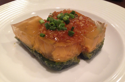 大きなウニが煮こごりの中に入っており、アオサの煮こごりとサンドした一品。